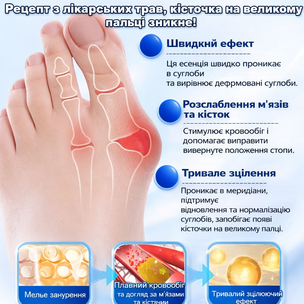 Крем для щоденного догляду за зоною «кісточки» (вальгусної деформації) біля великого пальця. Допомагає зменшити дискомфорт від тиску взуття, сухість та стягнутість шкіри, робить ходьбу приємнішою та легшою. Формат 30 г — зручно брати з собою.